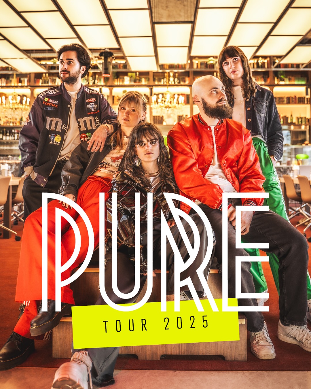 Mélodie, Lisa et Angélique, respectivement chanteuse, chanteuseguitariste et chanteuse-harpiste se rencontrent en 2016 à l’occasion d’un cours de chant. Pendant 2 ans, elles tissent des liens d’amitié et découvrent les harmonies vocales. C’est en 2018 que l’aventure démarre réellement. Alors qu’elles cherchent un batteur pour compléter leur formation, elles rencontrent Maxime, camarade de lycée : dès le premier concert c’est le coup de foudre ! Après son arrivée, le groupe abandonne progressivement les reprises folk pour se consacrer aux compositions. En 2026, Elie intègre l’équipe à la basse et apporte une touche groovy aux chansons pop acidulées du groupe. Influencés par Izia, Noga Erez ou encore Superbus, PURE sort son premier album “Pourquoi Pas” en octobre 2024. Après plus d’une année de